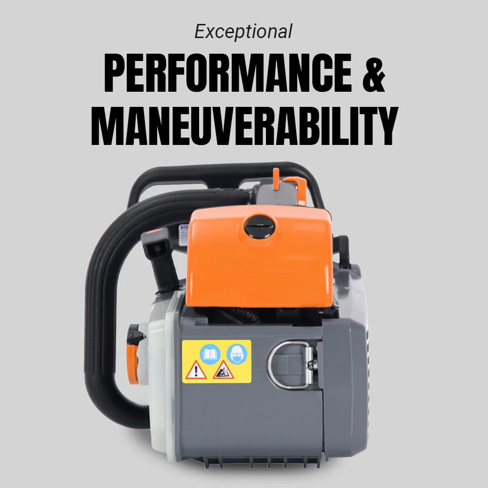 - Bar and chain options: 12-inch or 14-inch bar, allowing for extended reach and versatility in handling trees and logs.